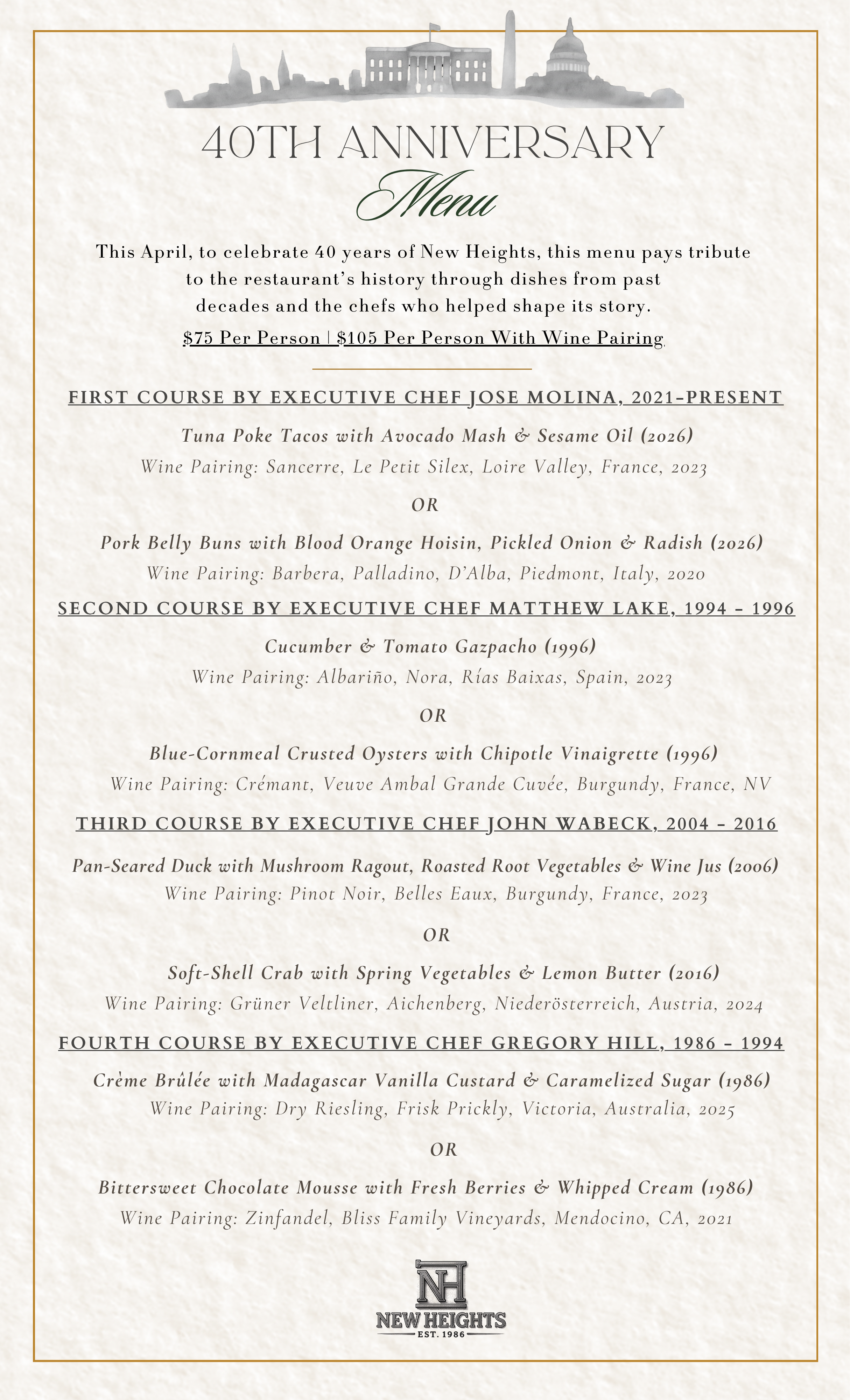 40th Anniversary Menu This April, to celebrate 40 years of New Heights, this menu pays tribute to the restaurant’s history through dishes from past decades and the chefs who helped shape its story from 1986 to 2026. RESERVE NOW