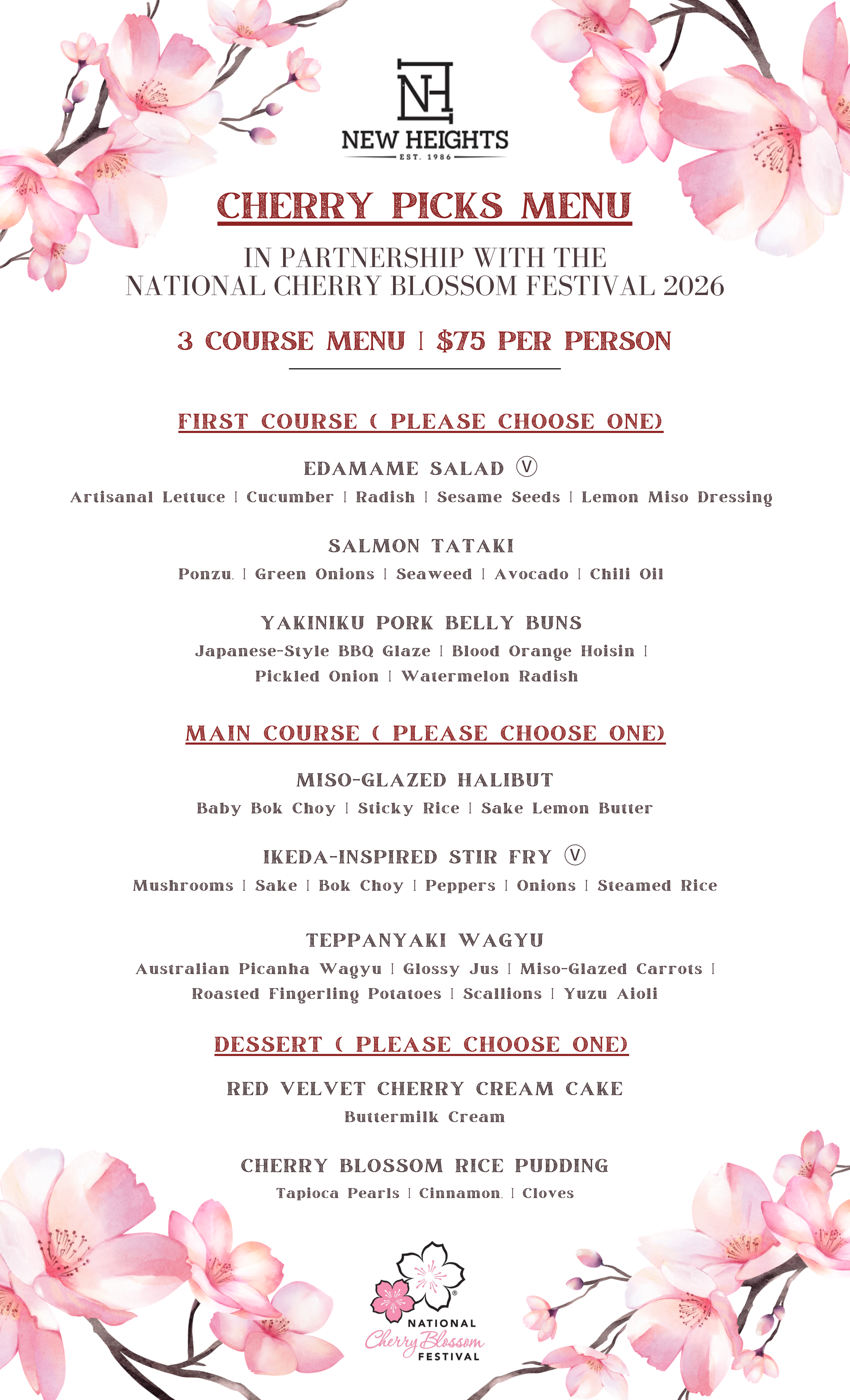 πΈπ½οΈ Experience the essence of Spring at New Heights Restaurant with our exclusive 3-Course Cherry Picks Menu, crafted in partnership with the National Cherry Blossom Festival. From March 20th to April 12th, 2026, indulge in Japanese-inspired dishes infused with delicate cherry blossom flavors, all for just $55 per person. Join us in celebrating the season's beauty and flavors. Reserve your table today! π½οΈπΈ