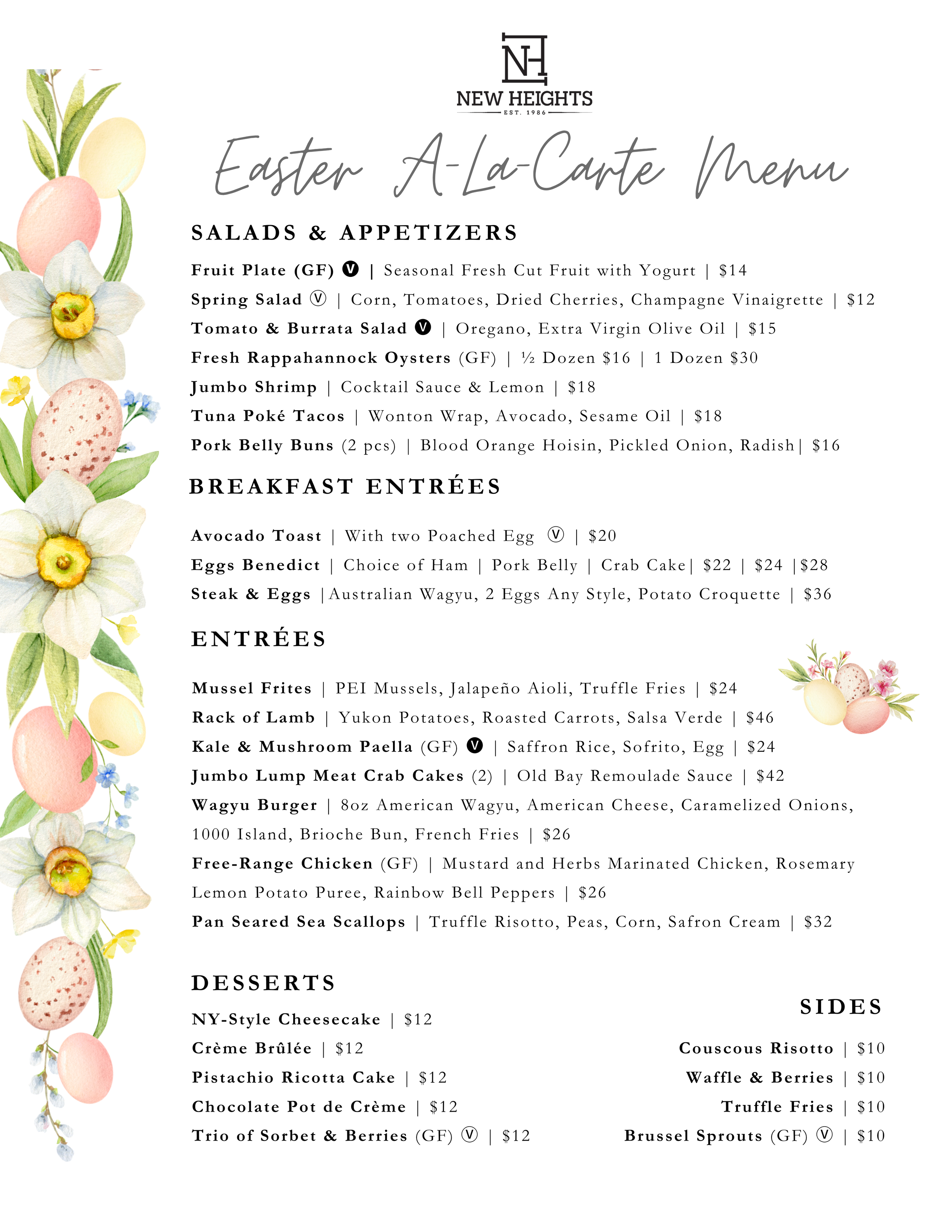 Make this Easter unforgettable with a blend of scrumptious cuisine, family fun, and the joyous spirit of the season. Reserve your table now for an eggs-traordinary Easter experience at New Heights! 🐣🥂