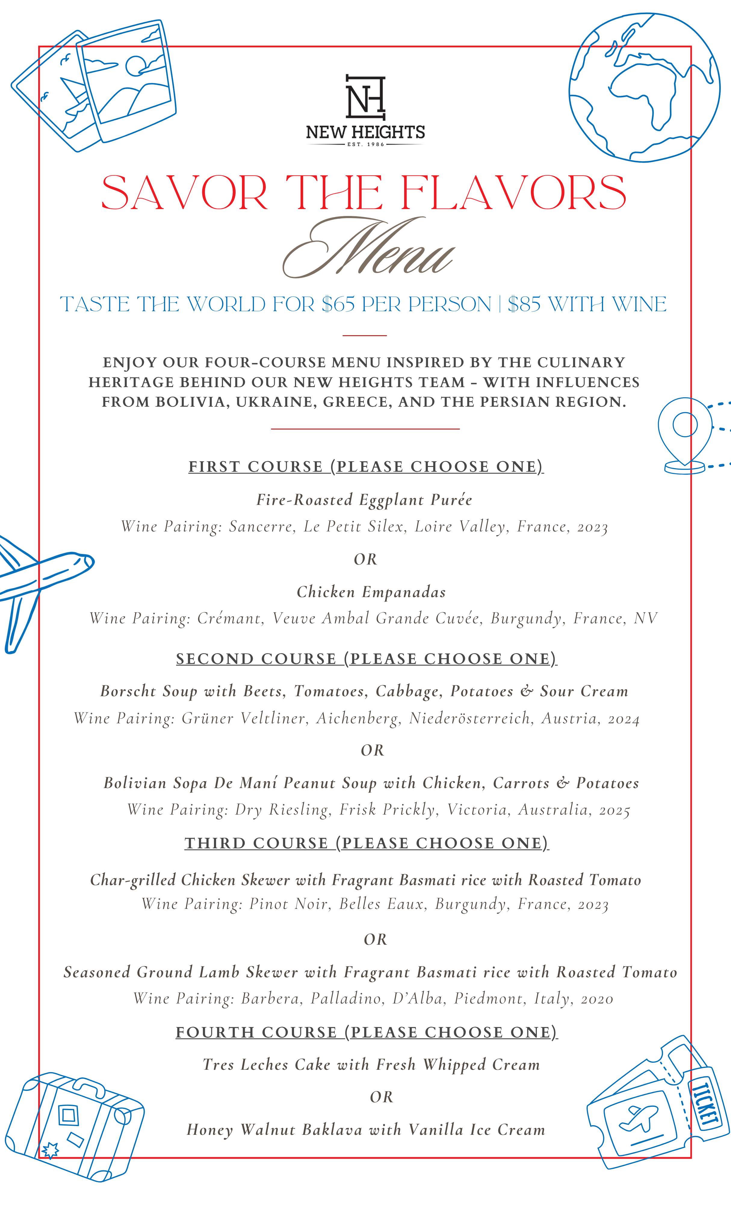 In celebration of Passport DC’s Savor the Flavors, New Heights invites guests on a four-course culinary journey inspired by the heritage behind our table. Drawing from the cultural roots of our ownership — Bolivia, Ukraine, Greece, and the Persian region — this limited-time menu offers refined interpretations of traditional dishes, thoughtfully paired with optional wines from around the world.